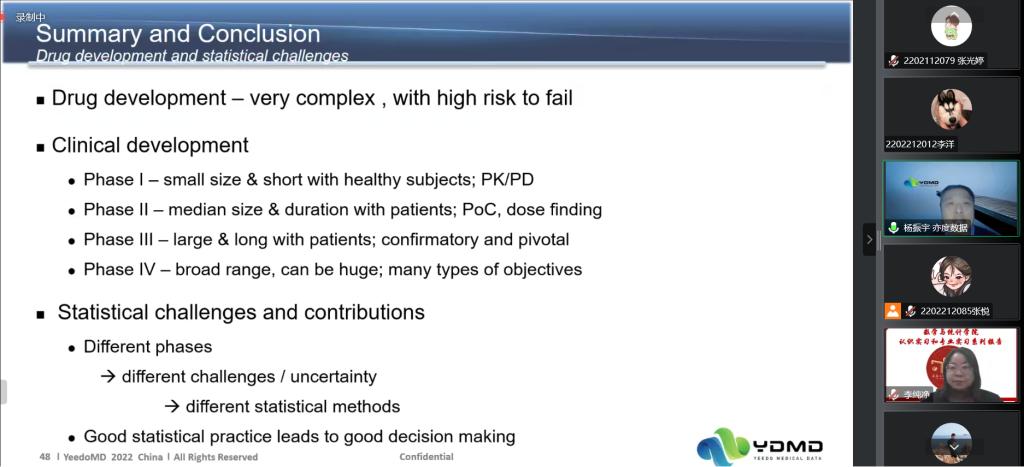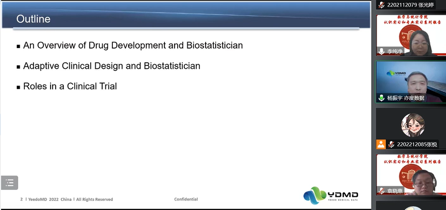 (通讯员:杨凯)2022年12月1日下午15:00,我院特邀辽宁亦度医药数据科技有限公司总经理杨振宇做题为《Drug development and the role of Biostatistician(创新药物研发及生物统计师所处角色)》的报告。报告由学院副院长李纯净主持,统计主任杨凯、统计系支部书记袁晓惠,以及统计系胡茜等青年教师以及2020级、2019级本科生以及研究生参加了本次线上报告。