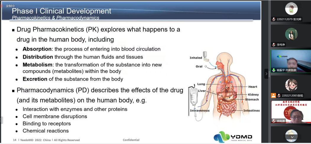 在报告会中,杨振宇老师从药物开发与生物统计概述、适应性临床设计和生物统计学家以及临床试验中的角色三个方面出发,系统地讲述了药物生产的全部流程,以及制药过程中可能会出现的问题。并在此基础上详细地介绍了统计师和编程师在整个药物研发的全周期的工作内容以及工作要求。最后,针对生物统计师的发展前景,对同学们学习能力和知识水平提出要求。