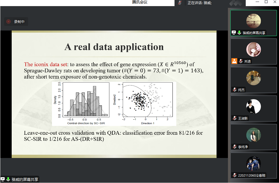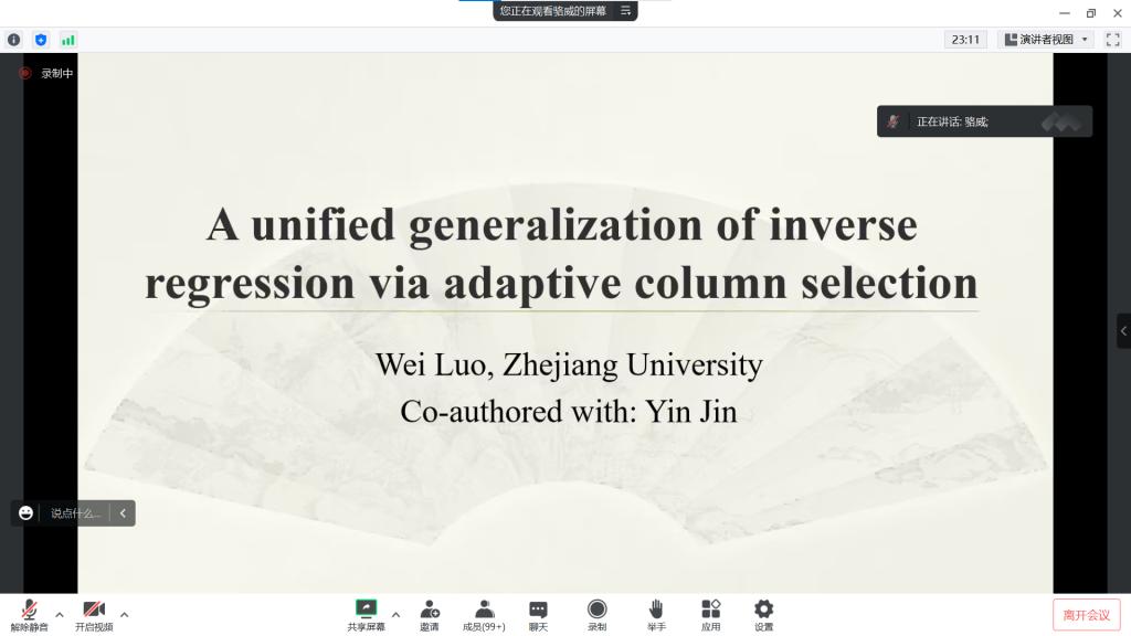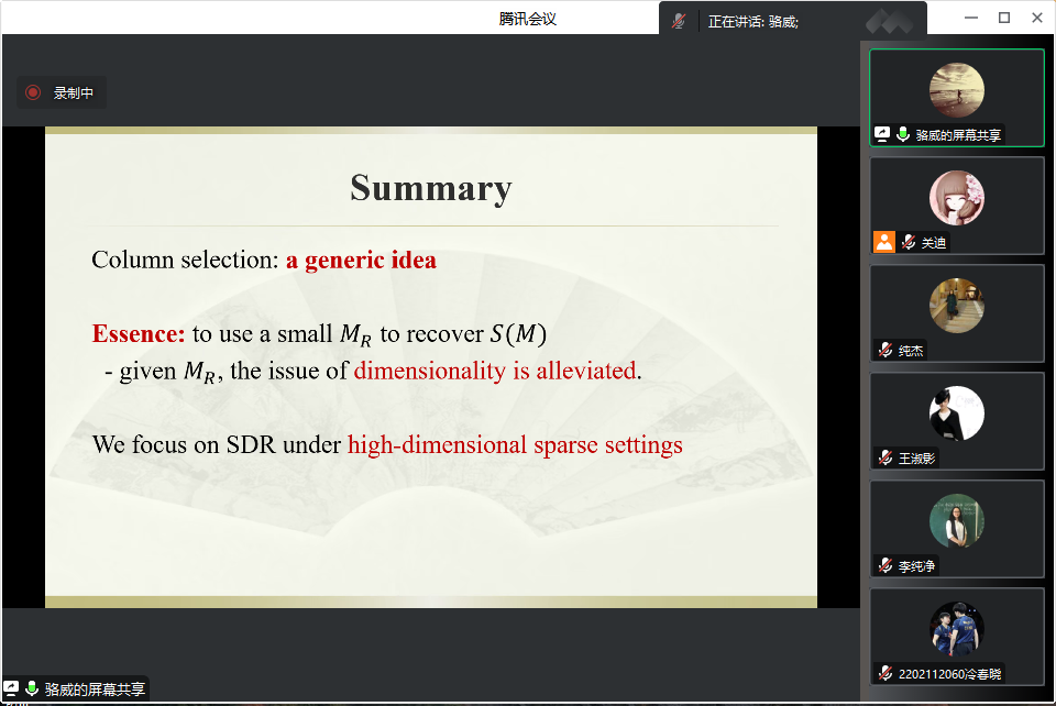 (通讯员:关迪)为了扩展学生的专业思维,提升专业知识的理论学习水平,2023年3月29日上午10:00,由欧冠官方网站主办的报告——“A unified generalization of inverseregression via adaptive column selection”在腾讯会议线上举行,特别邀请骆威老师作为主讲人,基于骆威老师本人的研究以及工作经历,为欧冠官网师生进行讲解,我院共有160多名师生前来参会讨论与学习。我院欧冠官方网站院长王纯杰、副院长李纯净、统计系主任杨凯、统计系副主任王淑影等学院部分老师、研究生参加了本次学术报告会,会议由欧冠官方网站院长主持。