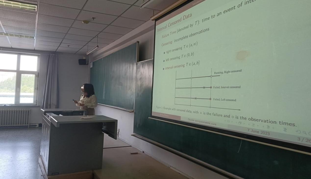 在接下来的报告中,刘晓玉教授围绕“Mixture Cure Model with both Semiparametric Components for Interval-Censored Data”开始讲解,通过生存分析删失数据、线性和非线性协变量、左删失、区间删失、右删失等方面进行知识讲解,用通俗易懂的语言与生活等其他方面都进行了联系与结合,由浅入深地向同学们讲解相关知识,使枯燥的知识变得有意思起来。