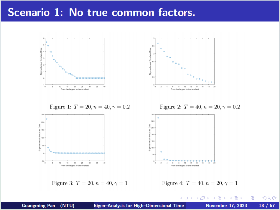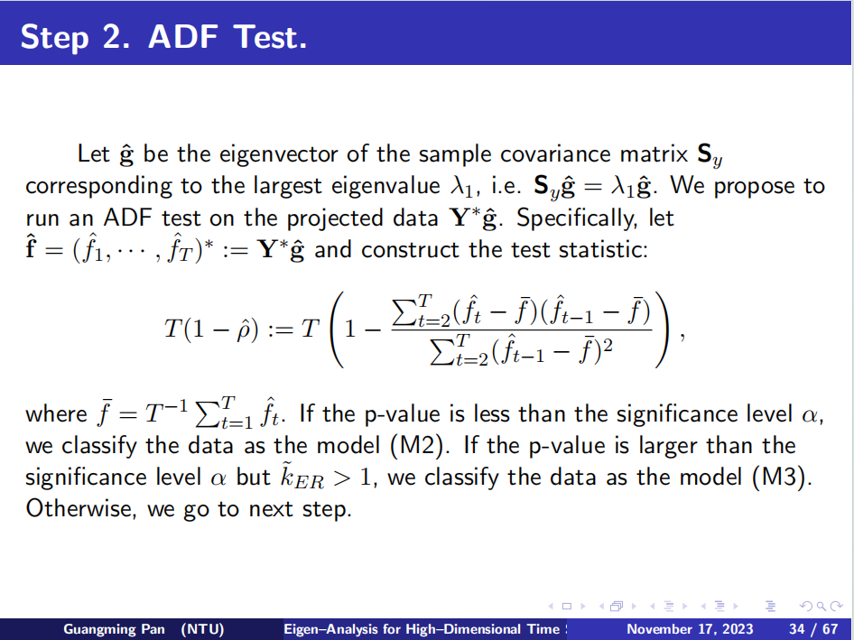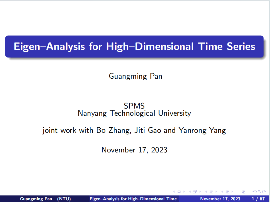 在接下来的报告中,潘教授讲述了高维时间序列的横截面结构和时间趋势是其重要特征。基于样本协方差矩阵的奇异值分析,他提出了一种新方法,用于识别高维时间序列的四种结构,这些结构根据因子结构和平稳性进行分组。所提出的三步方法包括:(1)经验特征值比率统计;(2)投影修正的Dickey-Fuller检验;(3)基于最大经验特征值的单位根新的检验方法。为这些三个统计量开发了渐近性质,以确保整个过程可行。通过各种模拟展示方法的有限样本性能,并将方法进一步应用于分析美国死亡率数据、房屋价格和收入以及美国部门就业情况数据集,这些数据都具有横截面相关性和非平稳时间相关性。需要强调的是,在死亡率预测方面文中给出了渐近性质的证明。