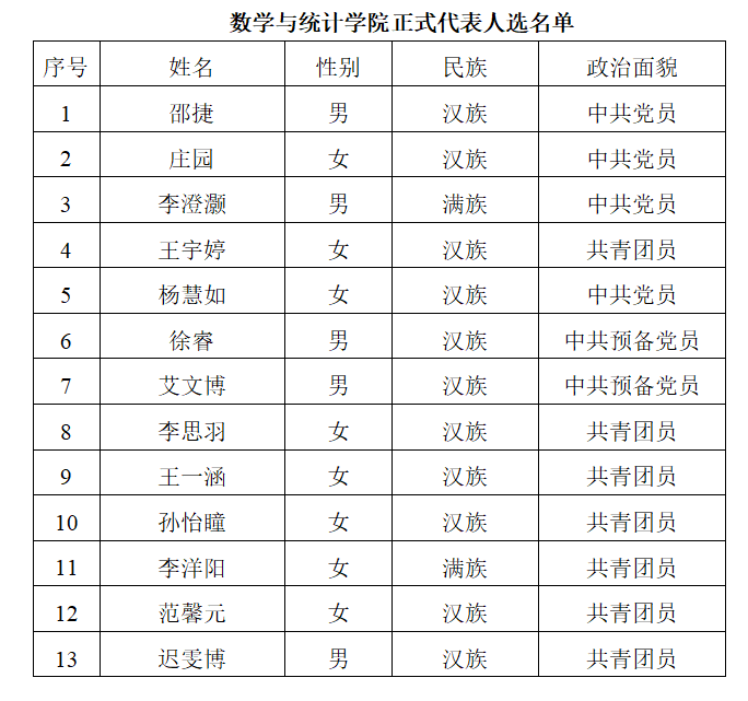 根据《共青团欧冠官方网站第二次代表大会代表选举工作办法》,经学院团员大会差额选举,现将学院团委选举产生的共青团欧冠官方网站第二次代表大会正式代表人选进行公示: