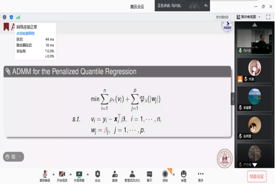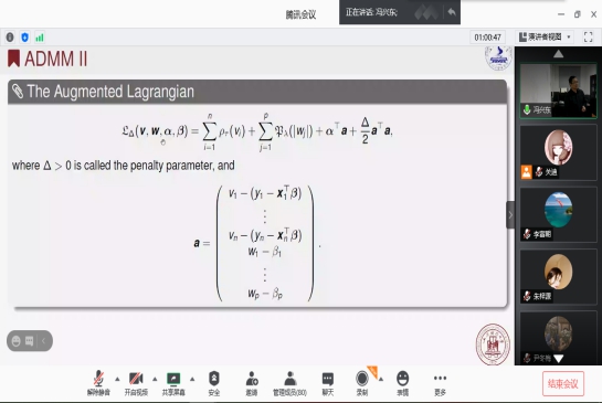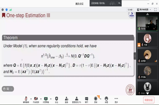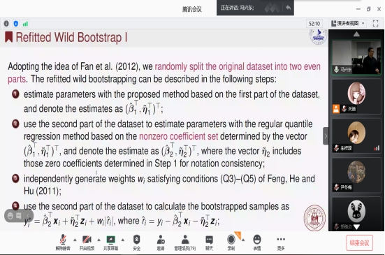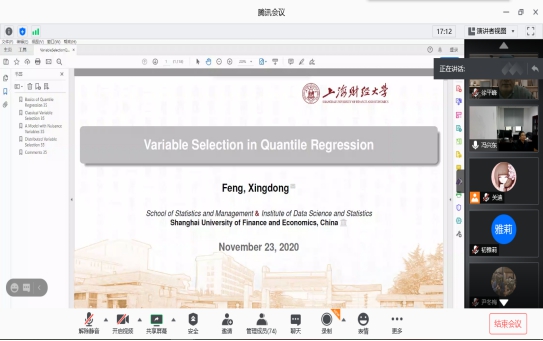 报告会中,冯兴东教授从分位数回归在经济学、金融学等学科领域中拥有着广泛的应用开始介绍,共同探讨哪些变量比较有用又是高维统计学中长期研究的热点问题。通过报告全局性地介绍了统计学中常见的分位数回归模型与该模型框架下的不同变量选择方法,以及适应大数据场景的分布式计算的相关内容。使大家对分位数中变量选择产生了浓厚兴趣。