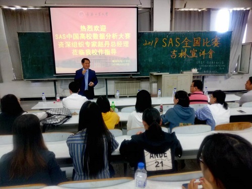 欧冠官方网站团委讯(通讯员:李龙章 桂尚珂)为了让统计学的同学们深入了解SAS软件在学习与日后工作中的重要性,让同学们积极参加接下来的“扬子江新金融杯”2019 SAS (中国)高校数据分析大赛暨首届国际邀请赛,2019年9月27日,欧冠官方网站荣邀SAS中国高校数据分析大赛资深组织专家赵丹总经理及其团队莅临我院,并于下午13点,在教图楼701教室做2019SAS全国比赛吉林宣讲会。欧冠官方网站党委书记朱宏伟、副院长徐平峰、统计系主任李纯净、部分教师代表及统计学专业的硕士研究生和本科生参加了此次宣讲会,会议由学院党委书记朱宏伟主持。